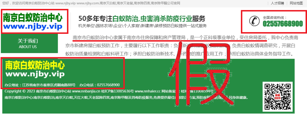 上述图片非南京市白蚁防治服务中心对外宣传网页,南京市白蚁防治服务中心位于南京市秦淮区虎踞南路88号,未开设官方网站,也未在任何搜索引擎设置宣传页面。所有咨询和办理房屋白蚁防治相关的事项,均在微信公众号“南京房产微政务”中“房帮宁”页面下“白蚁业务”办理。
